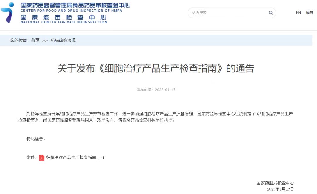 经国家药品监督管理局同意,2025年1月13日,国家药监局核查中心发布《细胞治疗产品生产检查指南》。